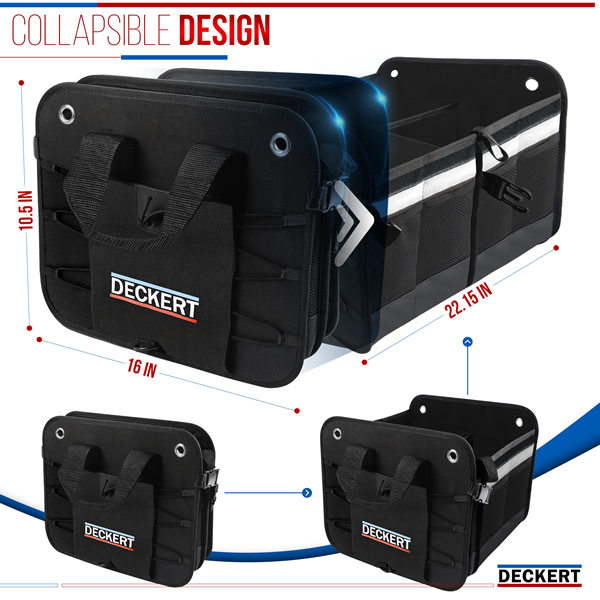 Sturdy 600D Oxford Polyester, Collapsible, Multi compartments, Securing straps, Suitable for any car type, Black with Reflective Stripes